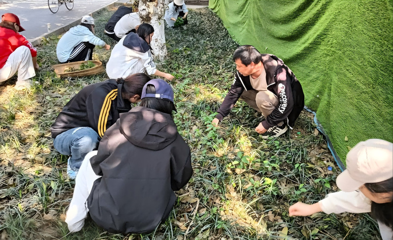 结合校园实际,物业中心精准组织实践劳动。落叶季统筹学生集中清扫校道和绿地落叶,保障校园整洁畅通;安排专人现场指导学生辨识清除草地绿篱杂草,维护绿化景观;依托“四季花海”实践基地开展花卉种植,融入品种、种植及养护知识讲解,推动劳动教育与美育融合;同时组织学生参与教学楼宇保洁,提升劳动技能。