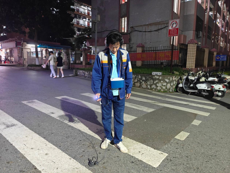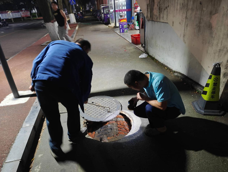 排查工作充分利用深夜校园用水低谷期便于检测的有利窗口,根据管网分布实际情况,科学拟订排查方案,将老旧管网、易发渗漏区域及夜间用水异常点位列为重点排查对象,采取“核水表、查排水、仪器探”相结合的方式,多管齐下、协同推进。排查人员携带专业测漏仪器等装备,沿管线敷设路径逐段细致排查,认真查验污水井、水表、阀门及管道连接点等关键设施,重点关注井内水流状态、管道接口密封性、计量表具运行状态及井内积水等情况。对发现的疑似漏水隐患,运用专业探漏设备进行精准定位与复核,确保排查工作全覆盖、无遗漏。经过近3个小时的连续作业,排查人员成功找到2处地下管网隐蔽漏点,有效保障了校园供水“生命线”的安全稳定运行。