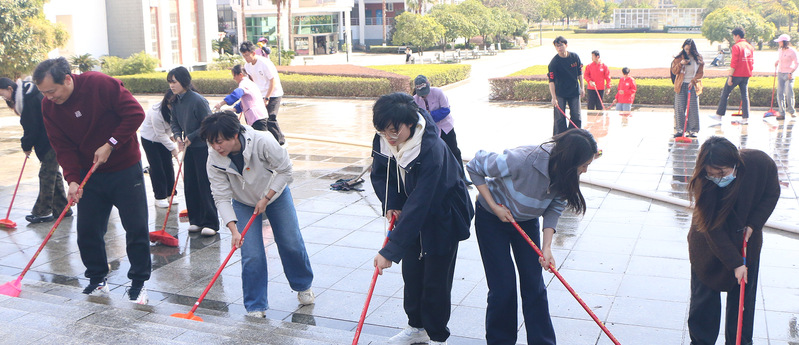活动现场,志愿者们在孔子广场集结分工,聚焦校园重点公共区域,对孔子广场、创新创业大楼周边道路、人行台阶及扶手开展全面清洁。面对顽固污渍、积垢和卫生死角,大家手持工具,分工协作、不怕脏累,细致完成冲水、刷洗、清淤等工作,不放过任何细节。经过集中整治,相关区域环境焕然一新,为师生营造了整洁舒适的校园空间。